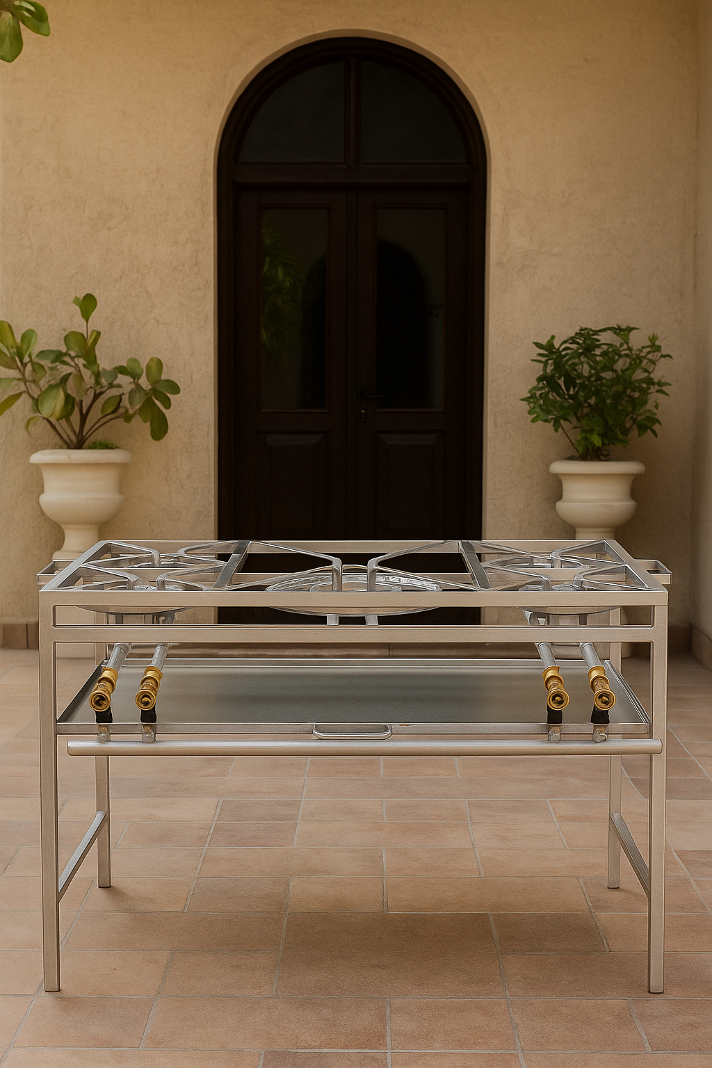يشتغل على غاز الأسطوانة بس، وله أرجل ثابتة عشان يعطي استقرار تام وقت الطبخ.